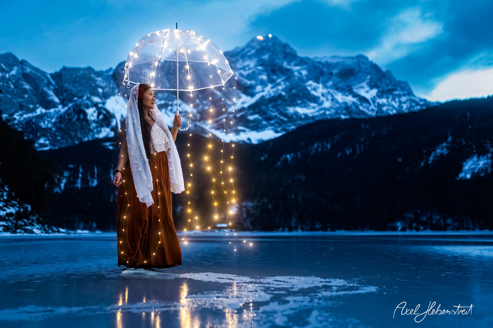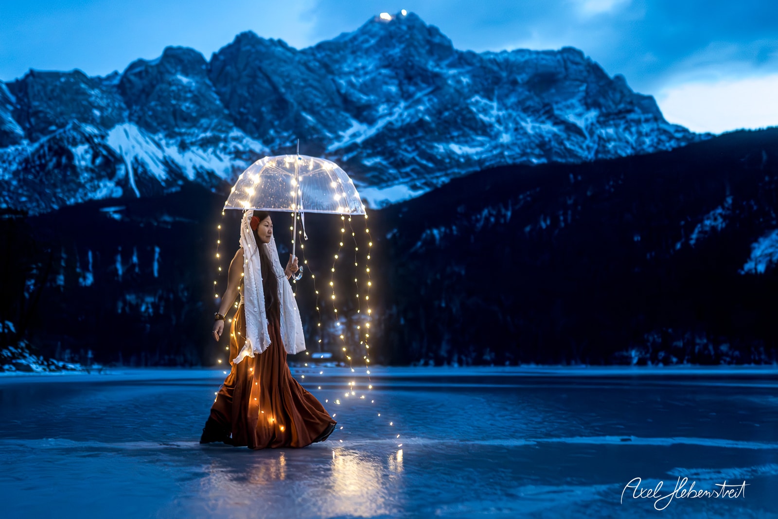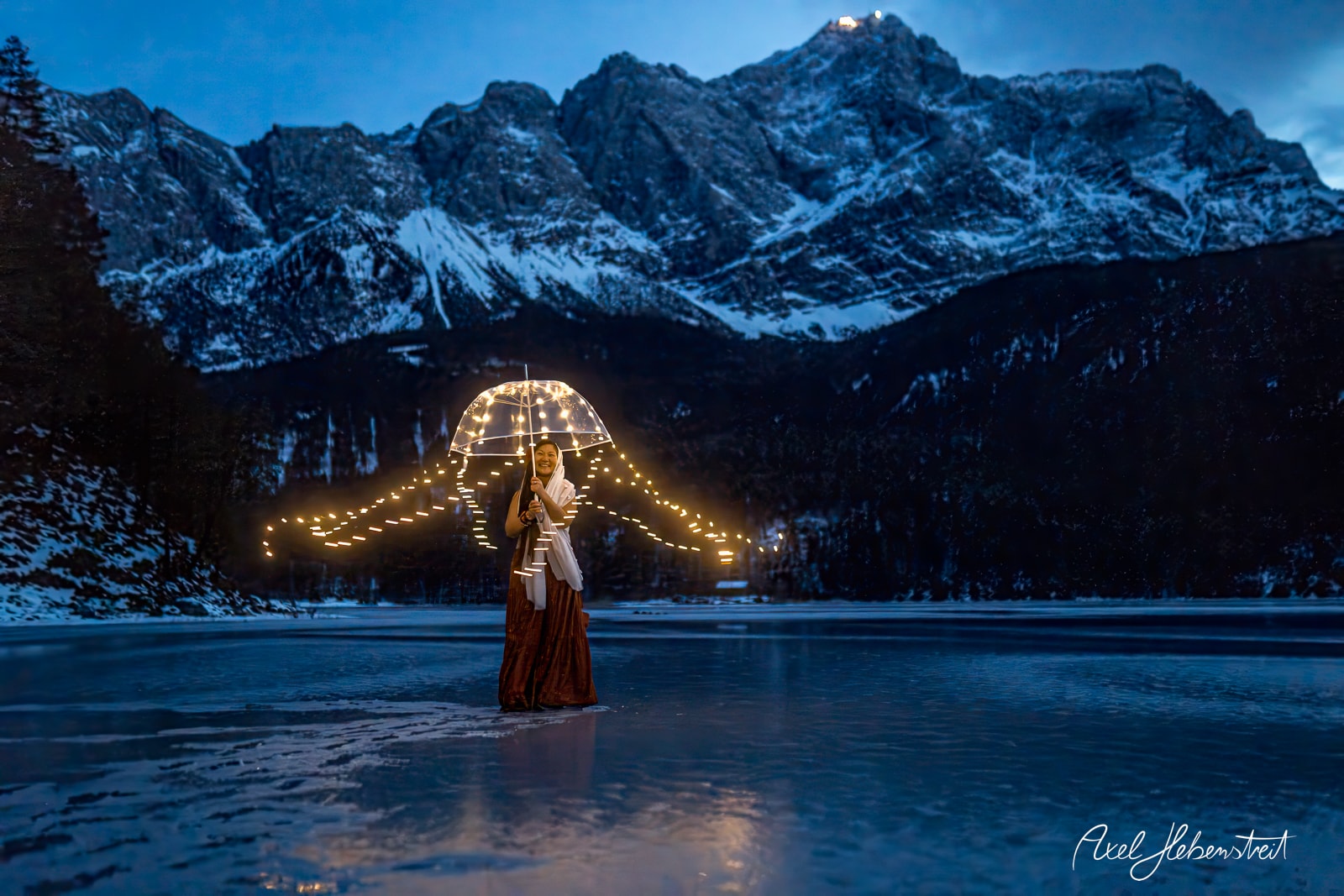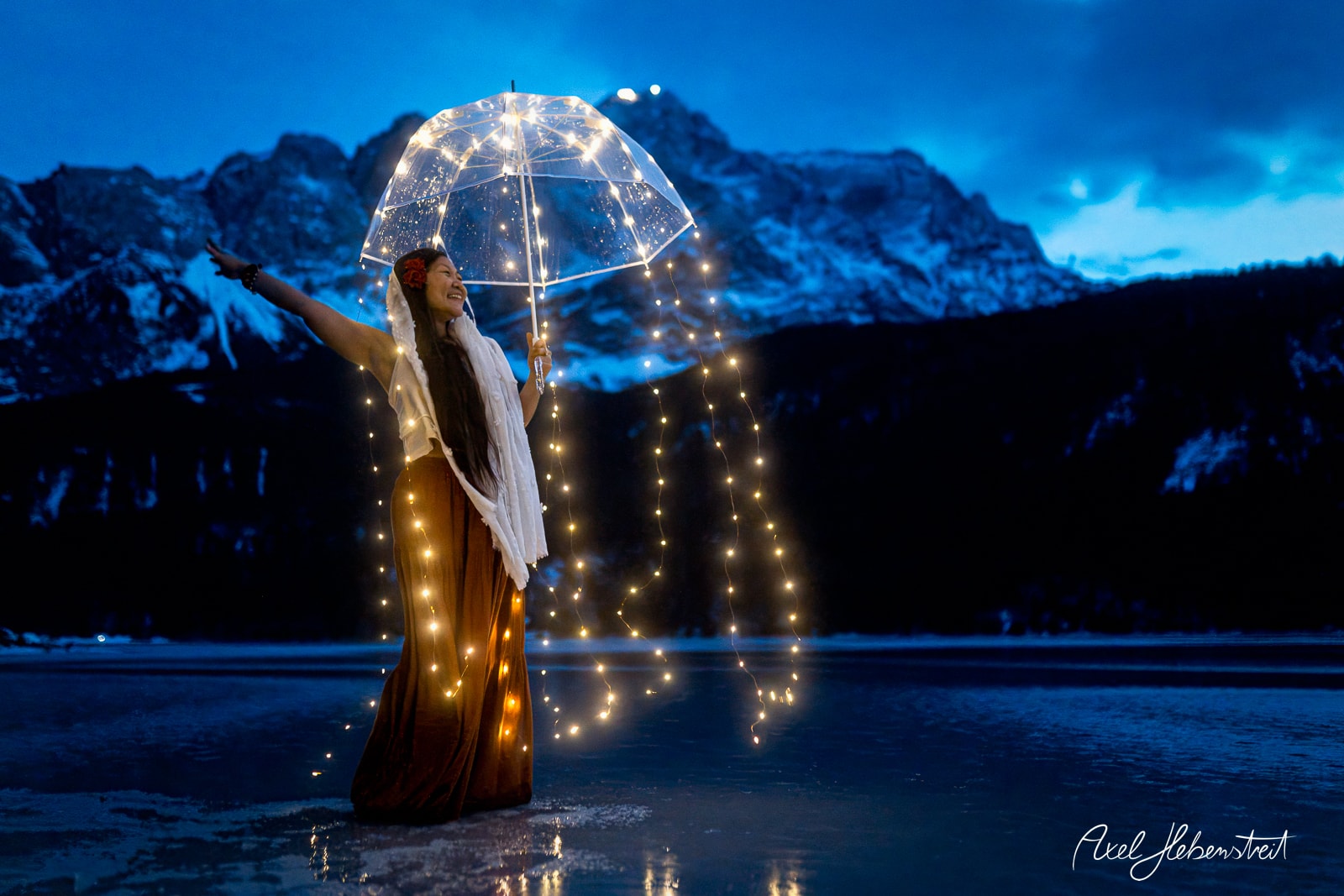 Leeliu und ich hatten unabhängig von einander die Vision einmal Fotos mit einem leuchtenden Lichter-Quallen-Schirm in der Natur in der Blauen Stunde zu machen. Letzten Sonntag war es dann endlich soweit. Zusammen mit einem selbstgebauten, transparenten Lichter-Regenschirm ging es an den zugefrorenen Eibsee am Fuße der Zugspitze. Zum Glück waren es statt der angekündigten minus 16°C nur minus 1°C, so daß Leeliu mit einem armfreien Top auf dem Eis sein konnte. Das Ganze hat dann nicht länger als 10 Minuten gedauert. Es ist so schön zu sehen, wie eine immaterielle Vision auf so einzigartige Weise materielle Realität werden kann!