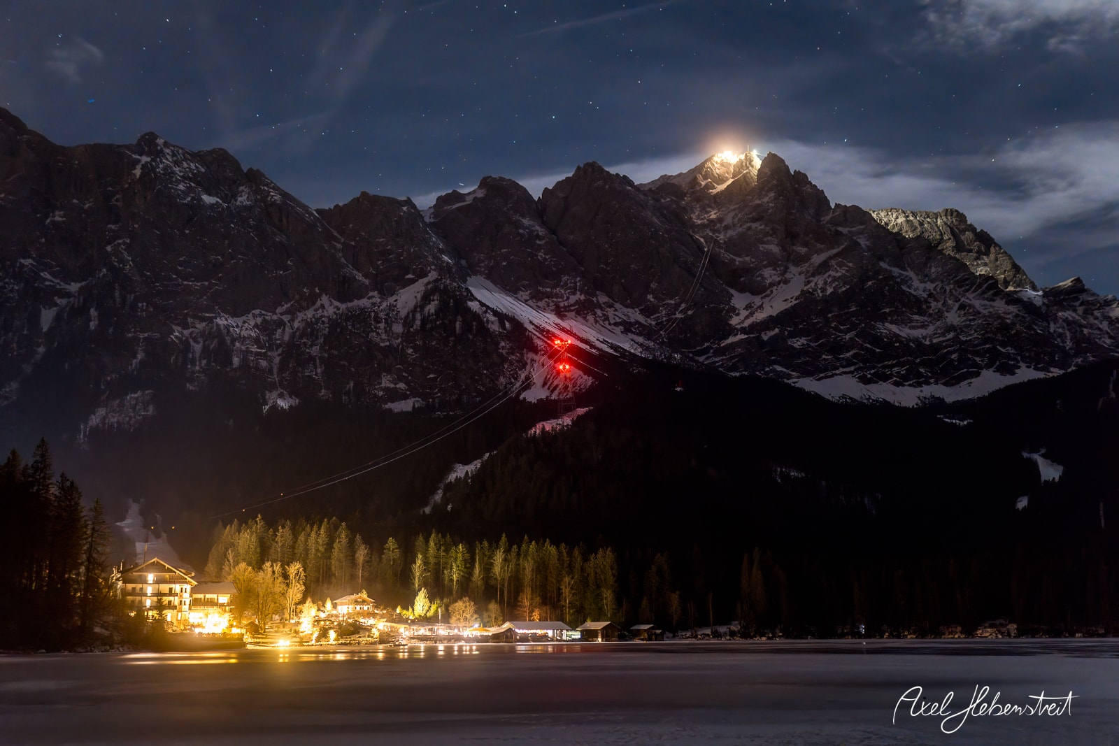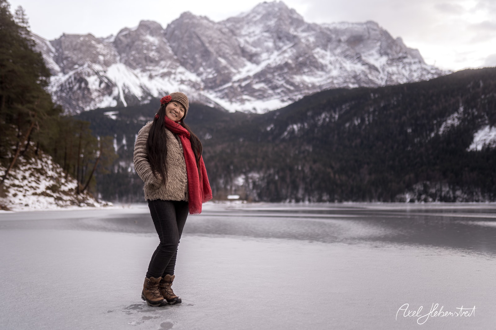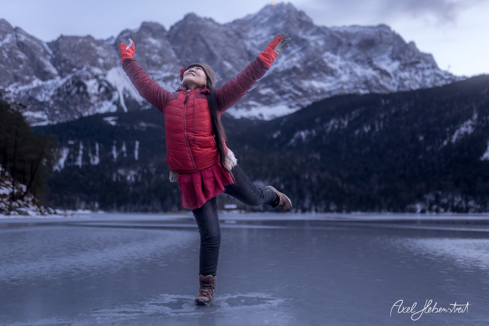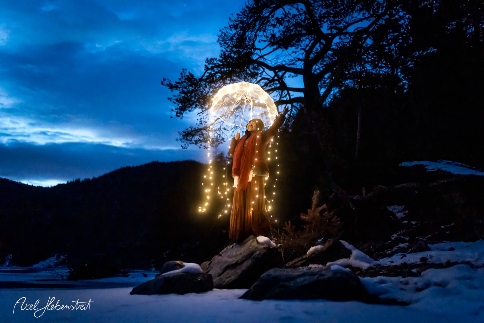 Leeliu und ich hatten unabhängig von einander die Vision einmal Fotos mit einem leuchtenden Lichter-Quallen-Schirm in der Natur in der Blauen Stunde zu machen. Letzten Sonntag war es dann endlich soweit. Zusammen mit einem selbstgebauten, transparenten Lichter-Regenschirm ging es an den zugefrorenen Eibsee am Fuße der Zugspitze. Zum Glück waren es statt der angekündigten minus 16°C nur minus 1°C, so daß Leeliu mit einem armfreien Top auf dem Eis sein konnte. Das Ganze hat dann nicht länger als 10 Minuten gedauert. Es ist so schön zu sehen, wie eine immaterielle Vision auf so einzigartige Weise materielle Realität werden kann!